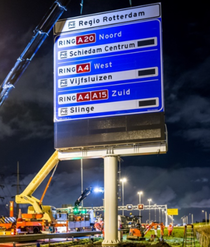 We developed, produced, and installed a total of eight Cradle-to-Cradle mast signs (four large and four small) and five Cradle-to-Cradle rider signs. The four mast signs for the A roads (largest size 6.5 m wide and 6.9 m high with a text display 6.5 m wide and 1.6 m high) and the four mast signs for the N roads (3.5 m wide and 2.7 m high with a text display measuring 3.5 m wide and 0.75 m high) are equipped with multiple VVX displays. The rider signs were installed to replace previously installed P+R signs.